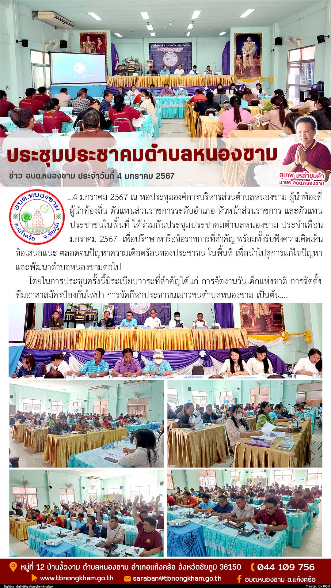 โดยในการประชุมครั้งนี้มีระเบียบวาระที่สำคัญได้แก่ การจัดงานวันเด็กแห่งชาติ การจัดตั้งทีมอาสาสมัครป้องกันไฟป่า การจัดกีฬาประชาชนเยาวชนตำบลหนองขาม เป็นต้น....