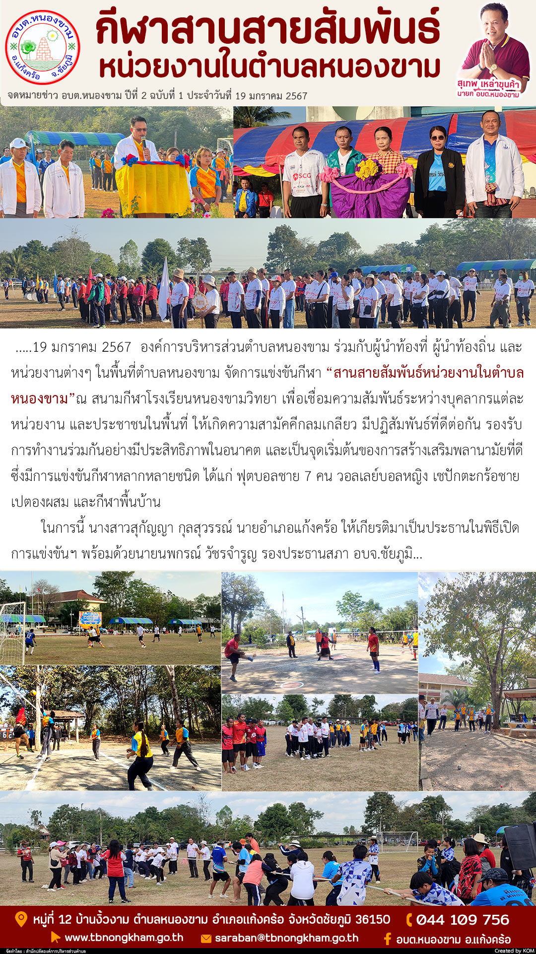 ..19 มกราคม 2567 องค์การบริหารส่วนตำบลหนองขาม ร่วมกับผู้นำท้องที่ ผู้นำท้องถิ่น และ หน่วยงานต่างๆ ในพื้นที่ตำบลหนองขาม จัดการแข่งขันกีฬา “สานสายสัมพันธ์หน่วยงานในตำบล หนองขาม”ณ สนามกีฬาโรงเรียนหนองขามวิทยา เพื่อเชื่อมความสัมพันธ์ระหว่างบุคลากรแต่ละ หน่วยงาน และประชาชนในพื้นที่ ให้เกิดความสามัคคีกลมเกลียว มีปฏิสัมพันธ์ที่ดีต่อกัน รองรับ การทำงานร่วมกันอย่างมีประสิทธิภาพในอนาคต และเป็นจุดเริ่มต้นของการสร้างเสริมพลานามัยที่ดี ซึ่งมีการแข่งขันกีฬาหลากหลายชนิด ได้แก่ ฟุตบอลชาย 7 คน วอลเลย์บอลหญิง เชปักตะกร้อชาย เปตองผสม และกีฬาพื้นบ้าน