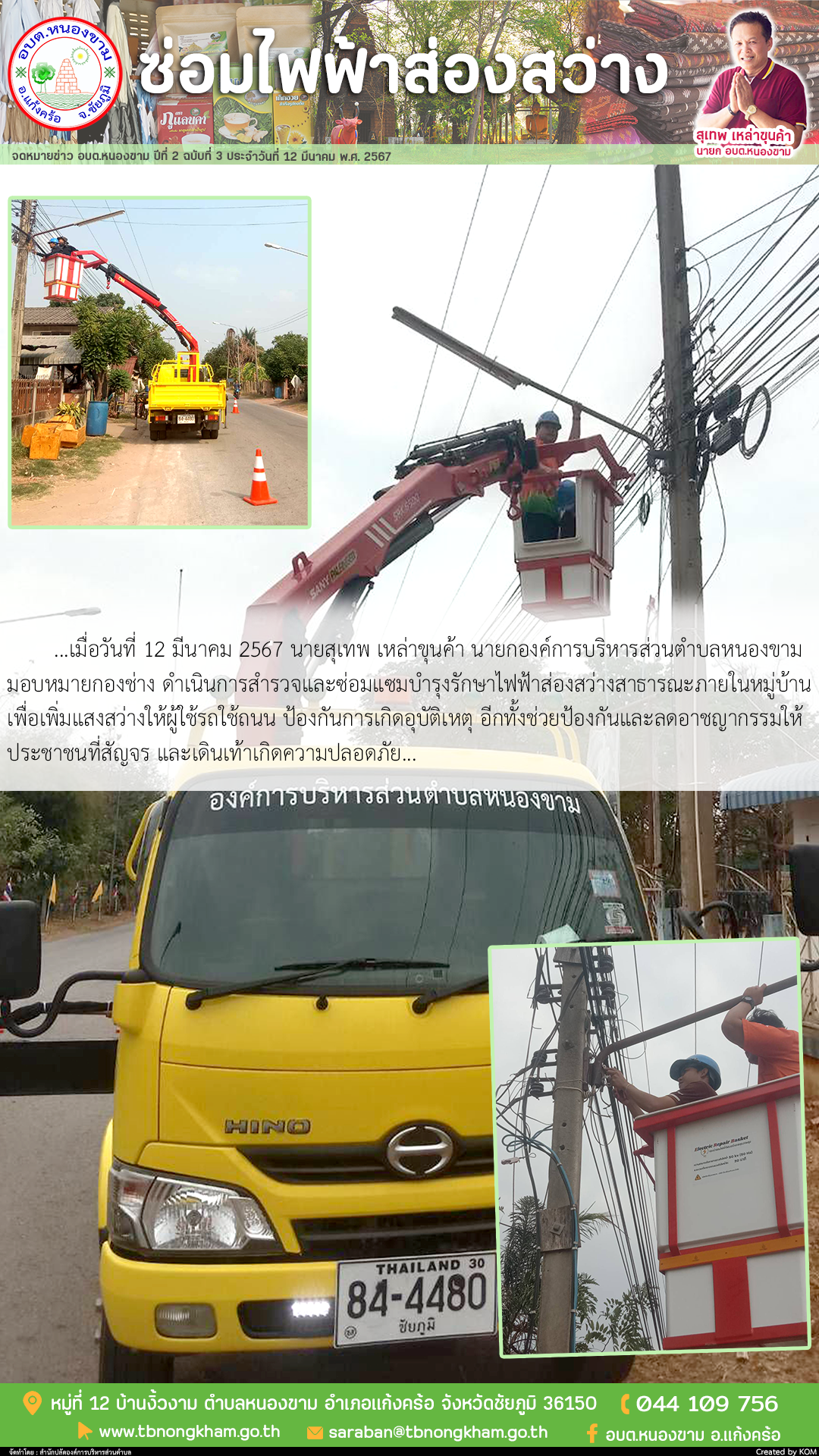 ...เมื่อวันที่ 12 มีนาคม 2567 นายสุเทพ เหล่าขุนค้า นายกองค์การบริหารส่วนตำบลหนองขาม มอบหมายกองช่าง ดำเนินการสำรวจและซ่อมแซมบำรุงรักษาไฟฟ้าส่องสว่างสาธารณะภายในหมู่บ้านเพื่อเพิ่มแสงสว่างให้ผู้ใช้รถใช้ถนน ป้องกันการเกิดอุบัติเหตุ อีกทั้งช่วยป้องกันและลดอาชญากรรมให้ประชาชนที่สัญจร และเดินเท้าเกิดความปลอดภัย...