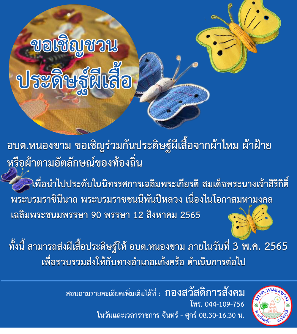 เพื่อให้การจัดนิทรรศการเฉลิมพระเกียรติฯ เป็นไปด้วยความเรียบร้อย สมพระเกียรติและให้ทุกภาคส่วนมีส่วนร่วม จึงขอเชิญชวนประชาชนในพื้นที่ ร่วมกันประดิษฐ์ผีเสื้อจากผ้าไหม ผ้าฝ้าย หรือผ้าตามอัตลักษณ์ของท้องถิ่น โดยให้มีขนาดและสีให้แตกต่างกันตามความเหมาะสม ส่งให้องค์การบริหารส่วนตำบลหนองขาม ภายในวันที่ 3 พฤษภาคม 2565 เพื่อรวบรวมส่งให้กับทางอำเภอแก้งคร้อ ต่อไป
